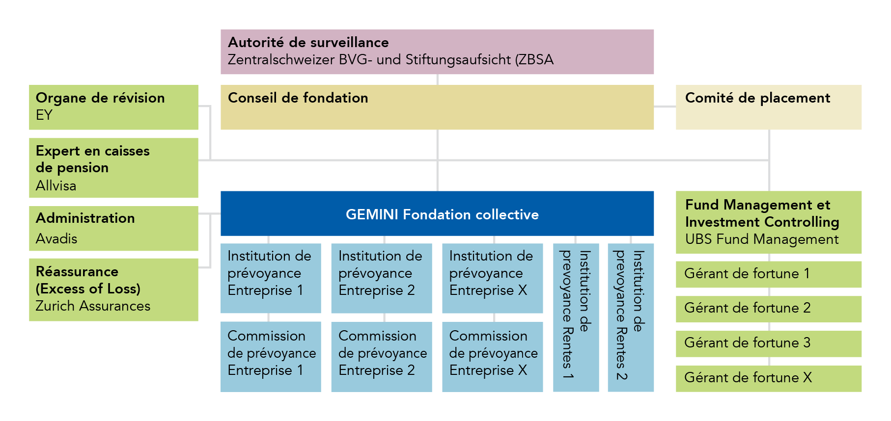 L’organisation de GEMINI Fondation collective s’appuie sur une structure éprouvée. Le Conseil de fondation assume la responsabilité stratégique, tandis que la direction est placée directement sous l’autorité de la fondation. La gestion administrative est assurée par Avadis Prévoyance SA, qui veille au bon déroulement des opérations quotidiennes.